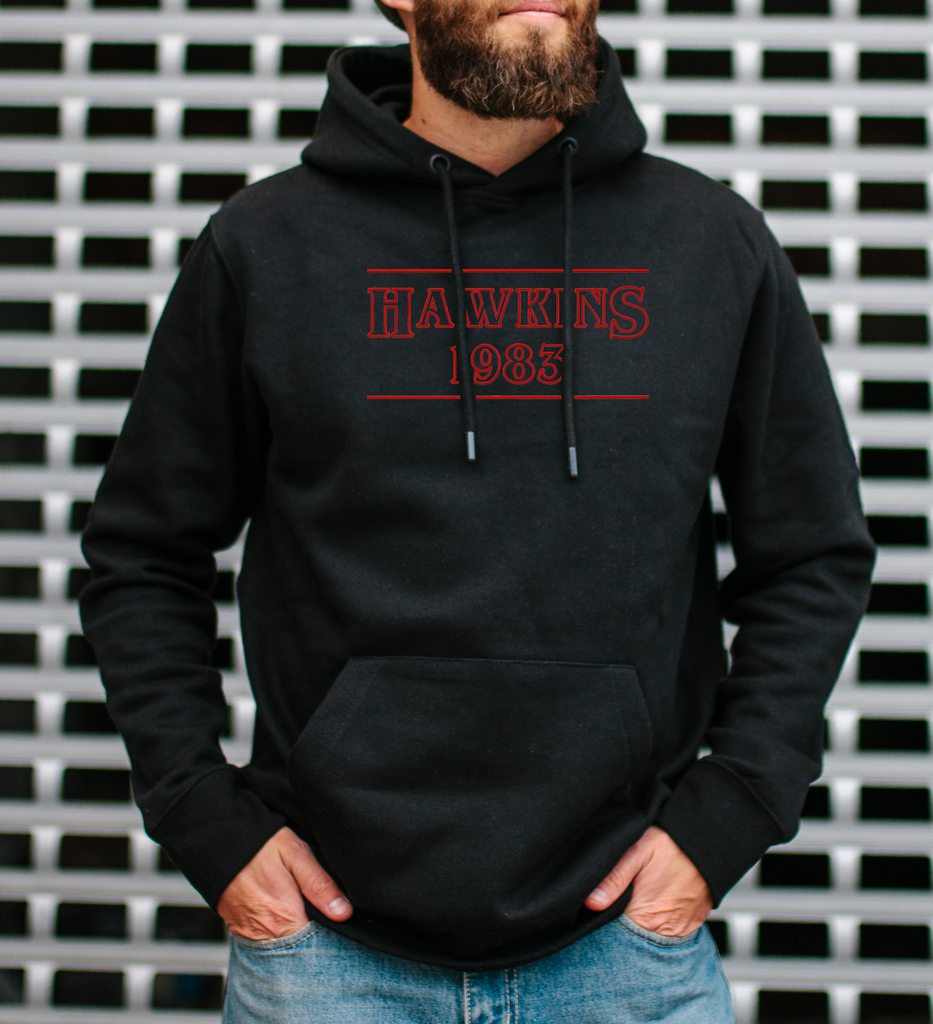Welcome to Hawkins, Indiana, the setting for the iconic Netflix series, Stranger Things. This premium black pullover hoodie features the classic "HAWKINS 1983" logo in a striking red retro font, making it the perfect apparel for any die-hard fan of Eleven, Dustin, Lucas, and the whole gang. It's more than just a sweatshirt—it's a cozy tribute to the mysterious 80s sci-fi world of the Upside Down.
